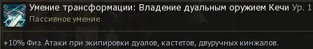 Исправлен скил Владение дуальным оружием Кечи. Почему-то давало 5% к маг. атаке и прибавку 5% ко всем видам оружия. Теперь работает по описанию. +10%% Физ. Атаки при экипировки дуальных мечей, кастетов, двуручных кинжалов.